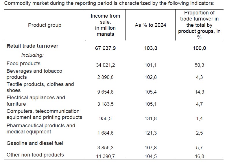 In 2025, products at 67,6 billion manats, including food, beverages and tobacco products at 36,9 billion manats and non-food products at 30,7 billion manats were sold to the consumers in the retail trade network. Compared to 2024 the retail trade turnover increased in real terms by 3,8 percent, including 1,2 percent for food products, beverages and tobacco products and 6,8 percent for non-food products.