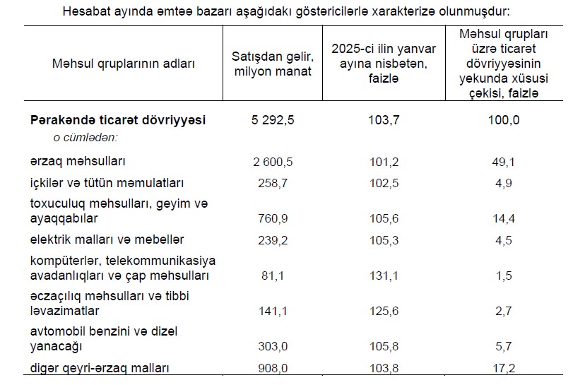 2026-cı ilin yanvar ayında pərakəndə ticarət şəbəkəsində istehlakçılara 5,3 milyard manatlıq, o cümlədən 2,9 milyard manatlıq ərzaq məhsulları, içkilər və tütün məmulatları, 2,4 milyard manatlıq qeyri-ərzaq malları satılmışdır. 2025-ci ilin yanvar ayı ilə müqayisədə pərakəndə ticarət dövriyyəsi real ifadədə 3,7 faiz, o cümlədən ərzaq məhsulları, içkilər və tütün məmulatları üzrə 1,3 faiz, qeyri-ərzaq malları üzrə 6,6 faiz artmışdır.