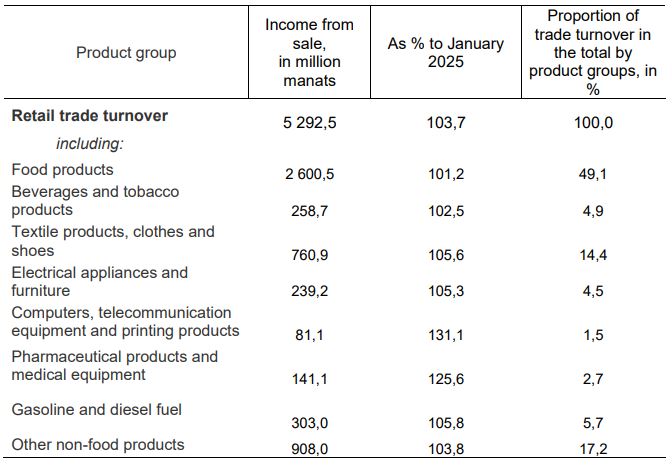 In January 2026, products at 5,3 billion manats, including food, beverages and tobacco products at 2,9 billion manats and non-food products at 2,4 billion manats were sold to the consumers in the retail trade network. Compared to January 2025 the retail trade turnover increased in real terms by 3,7 percent, including 1,3 percent for food products, beverages and tobacco products and 6,6 percent for non-food products.