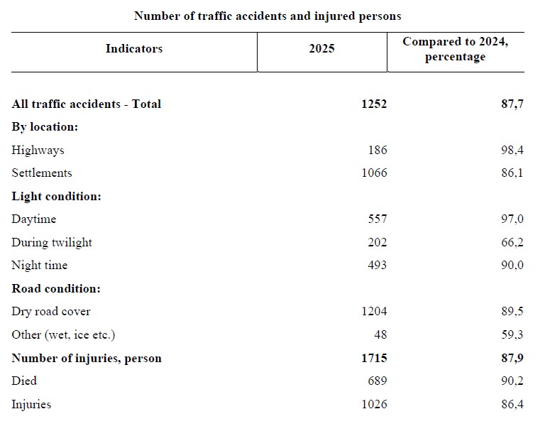 In 2025, 1252 or 12,3% less traffic accidents occurred compared to 2024, the number of victims of these events decreased by 12,1% and made 1715 people. 689 of suffered people died and 1026 of them were injured. 44,5% of accidents happened in the daytime, 39,4% - at night time, 16,1% - during twilight, 30,3% of accidents occurred on Saturdays and Sundays.