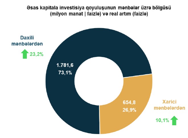 2026-cı ilin yanvar-fevral aylarında əsas kapitala 2436,4 milyon manat məbləğində və ya ötən ilin eyni dövrü ilə müqayisədə real ifadədə 19,4 faiz çox investisiya yönəldilmişdir. Neft-qaz sektoruna yönəldilmiş investisiyaların həcmi 51,4 faiz, qeyri neft-qaz sektoruna yönəldilmiş investisiyaların həcmi isə 5,1 faiz artmışdır.