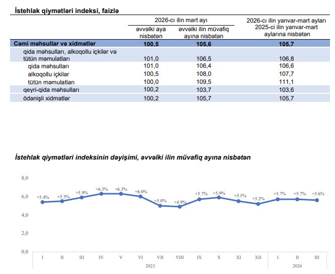 2025-ci ilin mart ayı ilə müqayisədə illik qiymət artımı 5,6 faiz, son bir ayda isə 0,5 faiz təşkil etmişdir.