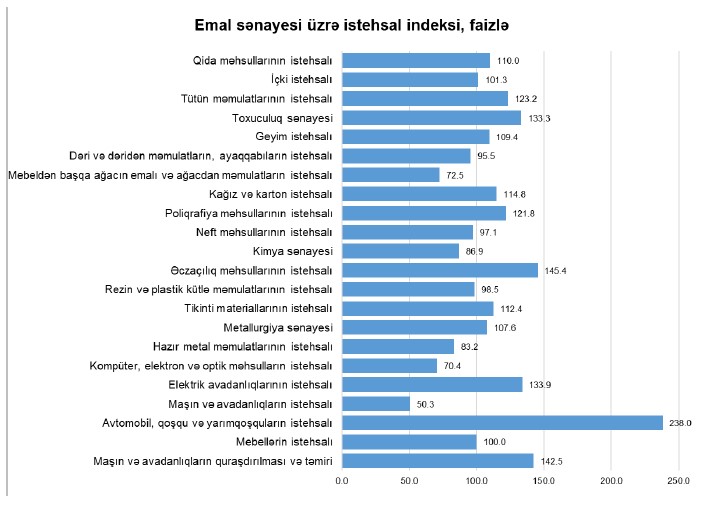 Emal sənayesində 2026-cı ilin yanvar-mart aylarında daha çox artım avtomobil, qoşqu və yarımqoşquların istehsalı, əczaçılıq məhsullarının istehsalı, maşın və avadanlıqların quraşdırılması və təmiri işləri, elektrik avadanlıqlarının istehsalı, toxuculuq sənayesi sahələrində olmuşdur.