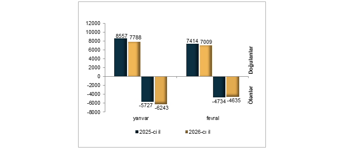 Cari ilin yanvar-fevral aylarında ölkədə 10878 ölüm halı qeydə alınmış və 2025-ci ilin müvafiq dövrü ilə müqayisədə əhalinin hər 1000 nəfərinə bu göstərici 6,3-dən 6,6-ya qədər artmışdır.