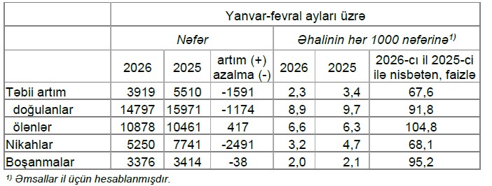 2026-cı ilin yanvar-fevral aylarında Ədliyyə Nazirliyinin rayon (şəhər) qeydiyyat şöbələri tərəfindən 5250 nikaha daxilolma və 3376 boşanma halları qeydə alınmış və 2025-ci ilin müvafiq dövrü ilə müqayisədə əhalinin hər 1000 nəfərinə nikahların sayı azalaraq 4,7-dən 3,2-yə, boşanmaların sayı isə 2,1-dən 2,0-a düşmüşdür.