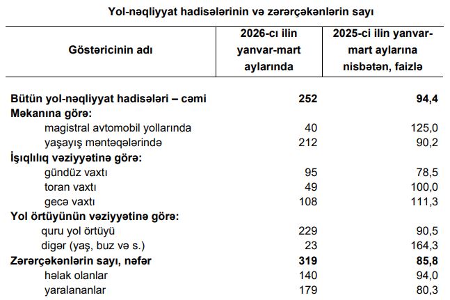 2026-cı ilin yanvar-mart aylarında 252 və ya 2025-ci ilin müvafiq dövrü ilə müqayisədə 5,6 faiz az yol-nəqliyyat hadisəsi baş vermiş, bu hadisələr nəticəsində zərər çəkən şəxslərin sayı 14,2 faiz azalaraq 319 nəfər olmuşdur. Onlardan 140 nəfər həlak olmuş, 179 nəfər isə yaralanmışdır. Hadisələrin 42,9 faizi gecə, 37,7 faizi gündüz, 19,4 faizi isə toran vaxtı baş vermişdir. Yol-nəqliyyat hadisələrinin 32,9 faizi həftənin şənbə və bazar günlərinə təsadüf etmişdir.
