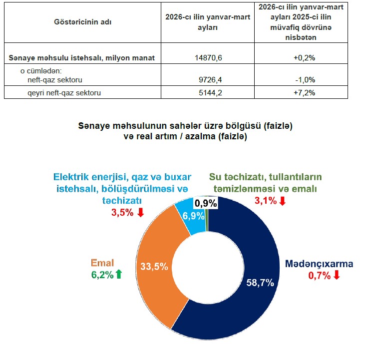 Sənaye sektorunda 2026-cı ilin yanvar-mart aylarında 14,9 milyard manat məbləğində və ya ötən ilin eyni dövrü ilə müqayisədə real ifadədə 0,2 faiz çox sənaye məhsulu istehsal edilmişdir.
