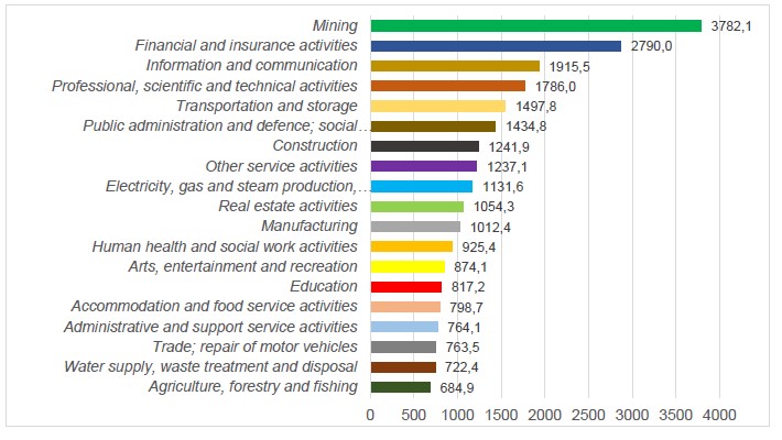 18,5 percent of employees were engaged in trade; repair of vehicles, 18,3 percent in education, 13,8 percent in industry, 8,6 percent in health and social services provided to population, 6,5 percent in construction, 6,1 percent in public administration and defense; social security, 4,4 percent in transport and warehouse, 4,0 percent in professional, scientific and technical activity, 2,4 percent in finance and insurance, 2,3 percent in agriculture, forestry and fishing and 15,1 percent in other fields of economy.