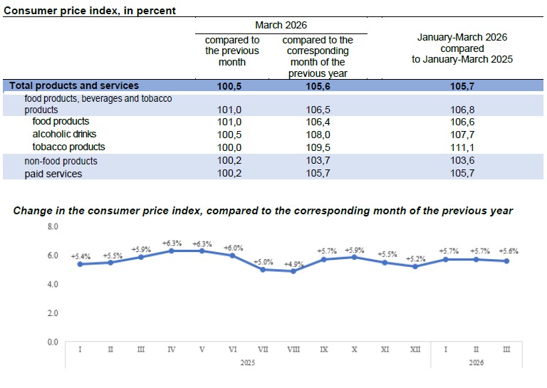 Consumer price index in January-March 2026 compared to January-March 2025 increased by 5,7%, including food products, alcoholic drinks and tobacco products 6,8%, non-food products 3,6% and paid services provided to population 5,7%.