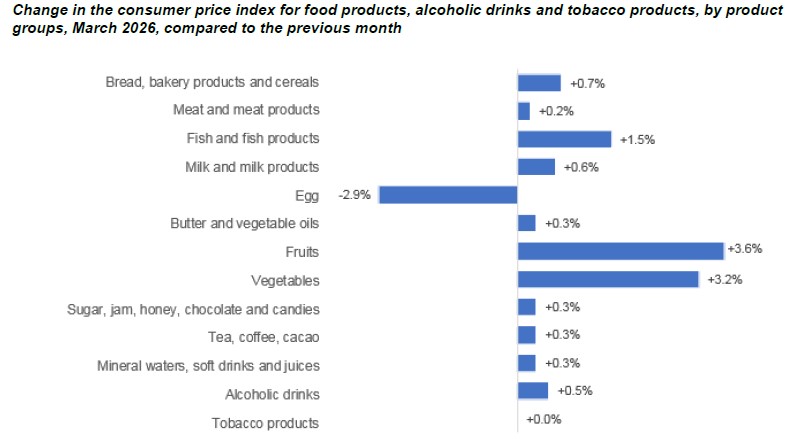 In March 2026, consumer prices for food products, alcoholic drinks and tobacco products increased by 1,0% compared to the previous month and by 6,5% compared to the corresponding month of the previous year.