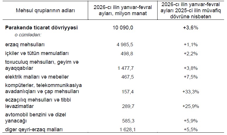 2026-cı ilin yanvar-fevral aylarında pərakəndə ticarət şəbəkəsində istehlakçılara 10,1 milyard manatlıq, o cümlədən 5,5 milyard manatlıq ərzaq məhsulları, içkilər və tütün məmulatları, 4,6 milyard manatlıq qeyri-ərzaq malları satılmışdır. 2025-ci ilin yanvar-fevral ayları ilə müqayisədə pərakəndə ticarət dövriyyəsi real ifadədə 3,6 faiz, o cümlədən ərzaq məhsulları, içkilər və tütün məmulatları üzrə 1,2 faiz, qeyri-ərzaq malları üzrə 6,5 faiz artmışdır.